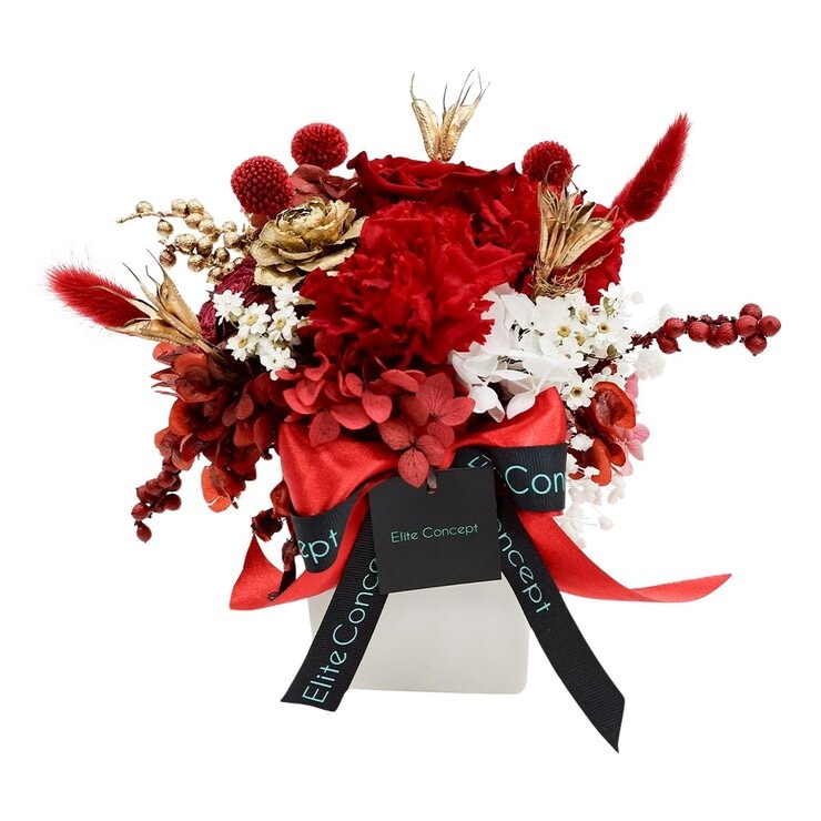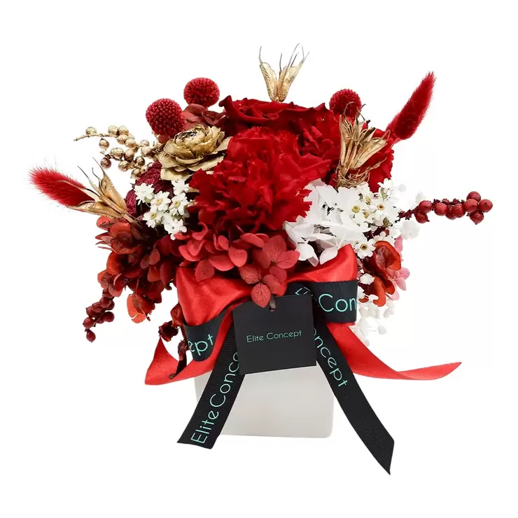 | 內容物 | 紅色永生康乃馨 X 2、大朵紅玫瑰 X 1、紅色金仗球 X 3、紅色兔耳草、暗紅色永生花、金色木玫瑰,索拉 X 2、永生滿天星、金色佛珠、花器、緞帶、提袋 |
