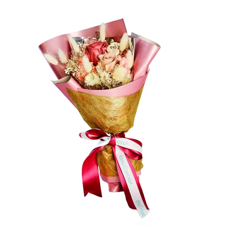 - 以永生粉玫瑰搭配法國白玫瑰、兔尾草與乾燥小菊花,營造甜美又柔和的氣息。