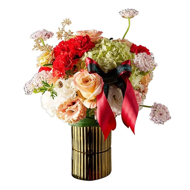 鮮明搶眼的紅色康乃馨與淺綠繡球及微光玫瑰互相交織,襯托著彼此的存在,卻互不掩蓋掉對方光芒,就像母親永遠溫柔地守候在孩子身旁,細心呵護也放手讓孩子自由的成長。