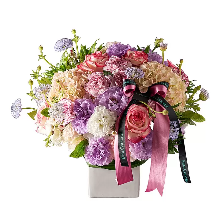 以雙色紫邊康乃馨為主,搭配進口富士粉玫瑰及淡粉繡球,再以色彩豐富且繽紛的各式花朵點綴,營造出欣欣向榮的幸福感。
