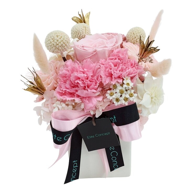 | 內容物 | 粉康乃馨永生花 X 2、大朵粉玫瑰、法國白梅、索拉 X 5、粉色兔耳草、白色金仗球 X 3、永生滿天星、永生白繡球、花器、緞帶、提袋 |