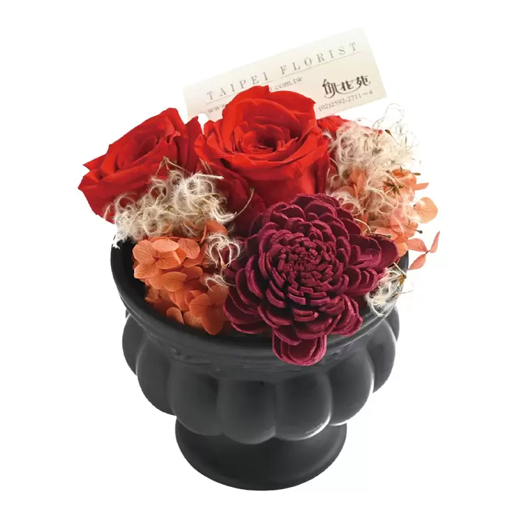 - 輕巧的黑色小花器,將永生紅玫瑰的經典之美凝結於此。小巧精緻的設計,讓每一個美好的時刻都能被珍藏。