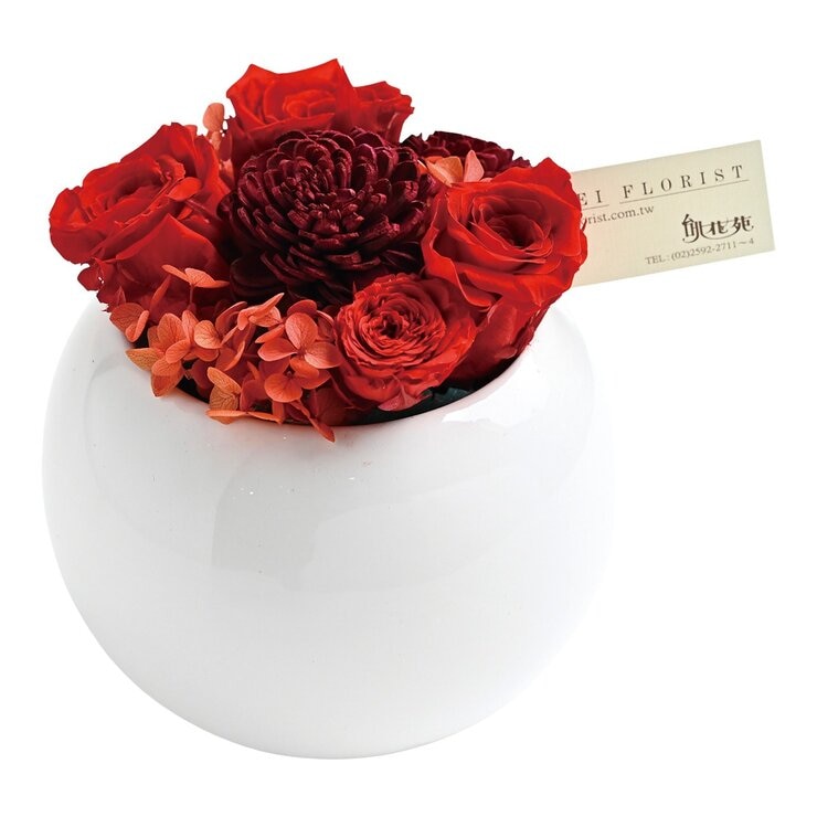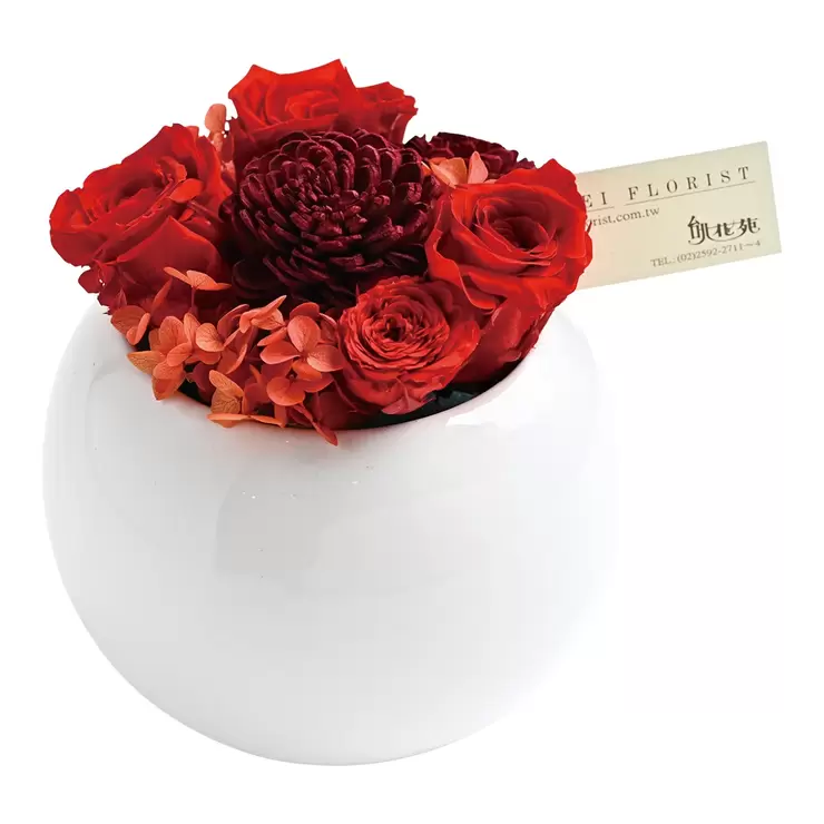 - 簡潔的白色圓形花器,搭配經典的永生紅玫瑰與紅繡球。這款花禮以其純粹的色彩與設計,優雅點綴生活中的每一處,讓美好長存。