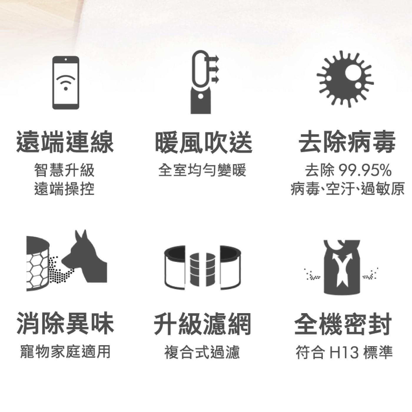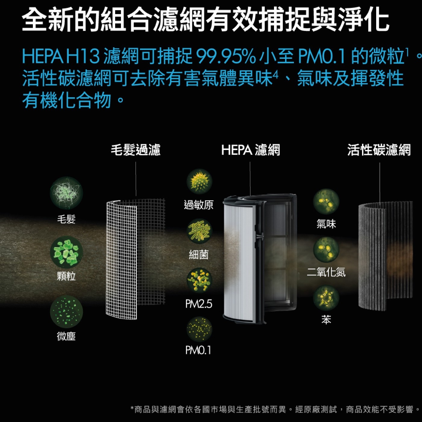 - 捕捉並鎖住污染物:HEPA H13 濾網,可捕捉 99.95% 小至 PM0.1 的微粒,包含過敏原、細菌、花粉和黴菌。