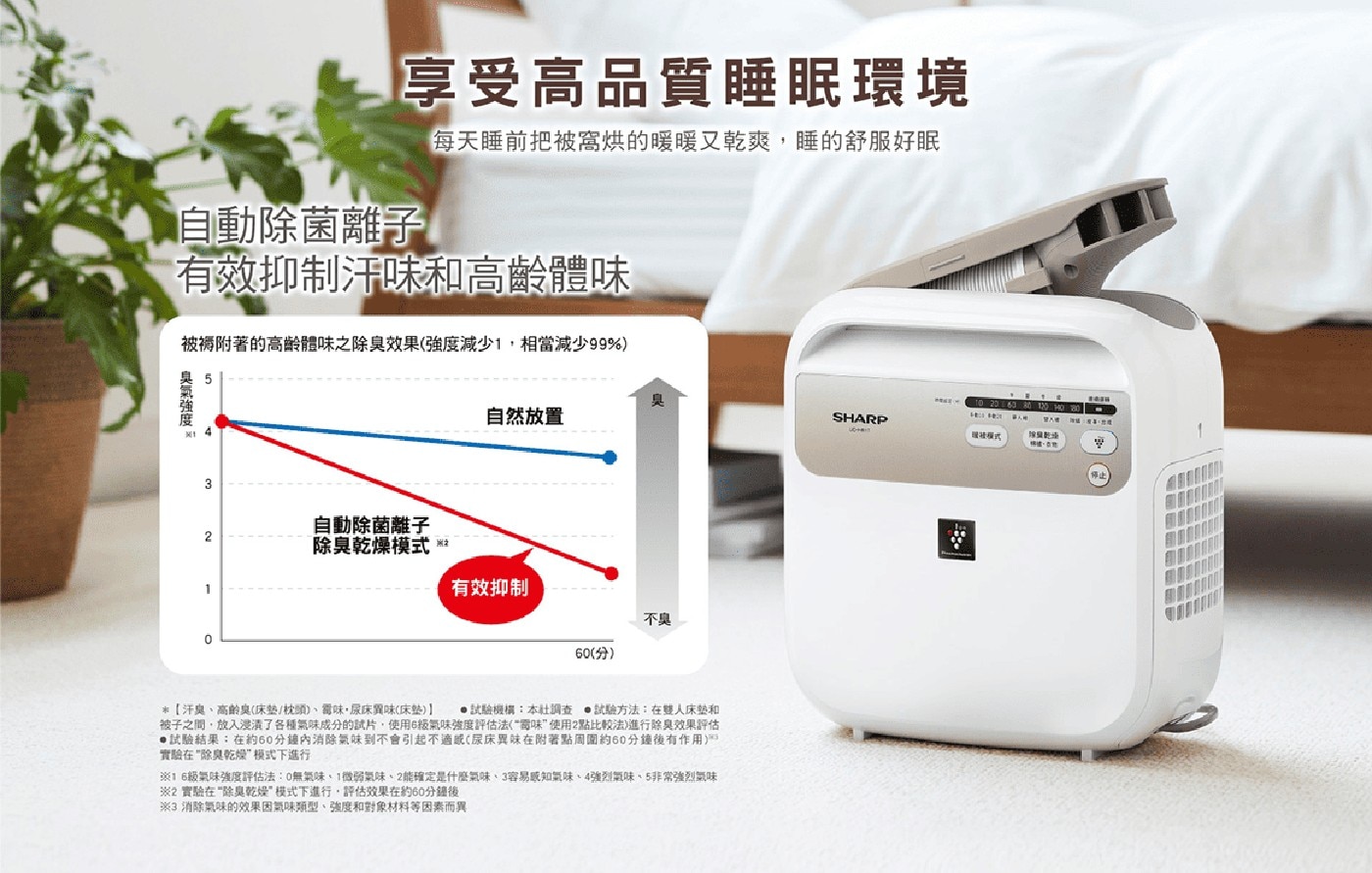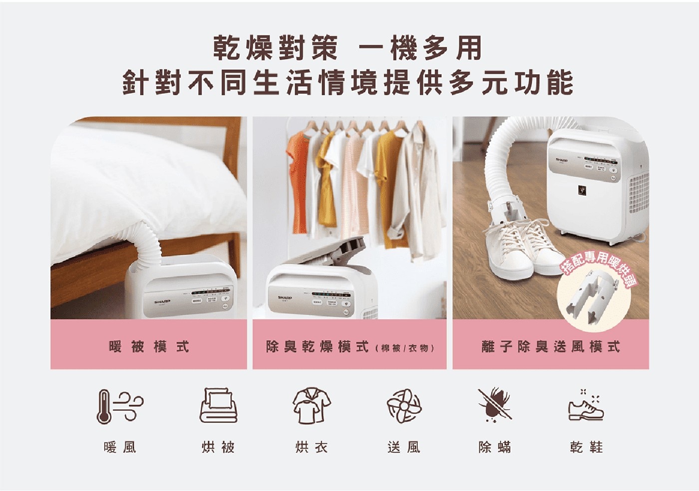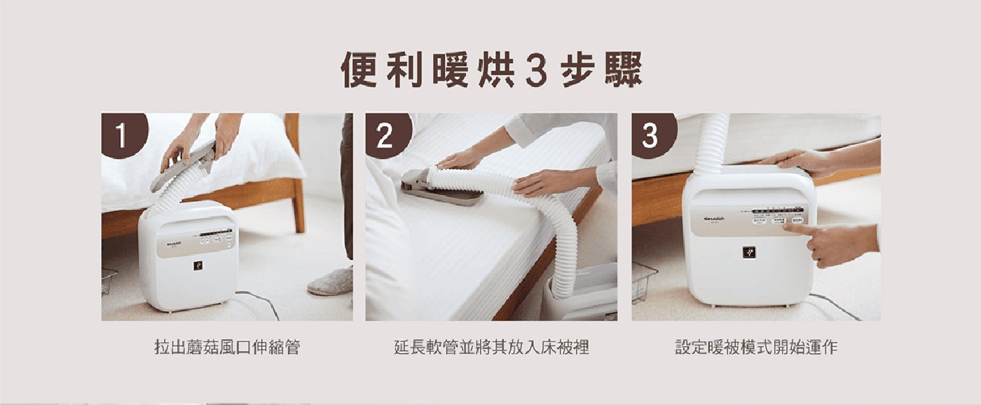 - 多種功能模式(暖被,寢具乾燥,除蟎,除箘離子送風,乾衣/鞋)