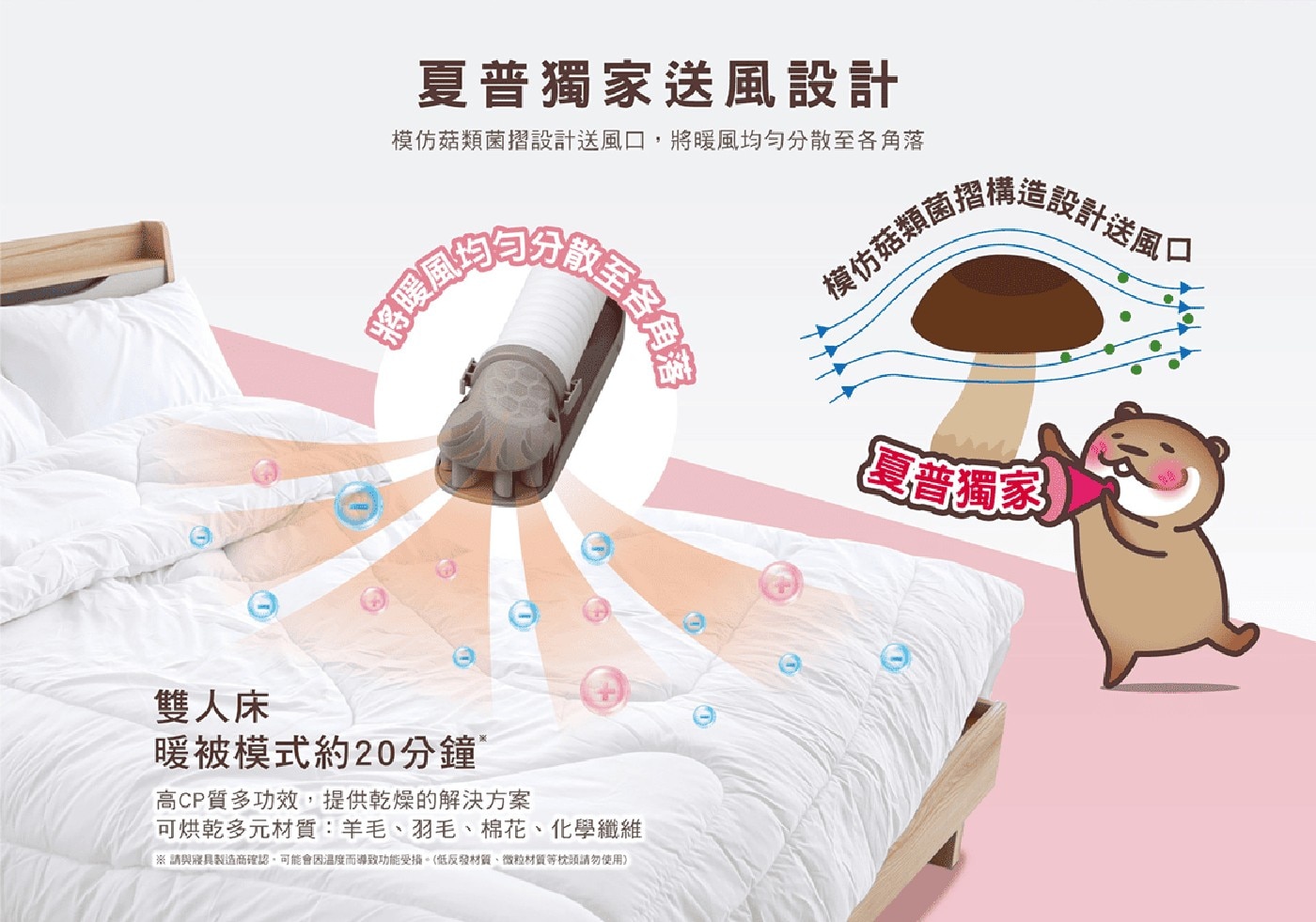 - 夏普獨家模仿菇類箘摺構造設計之送風口,能均勻將暖風送至棉被各個角落