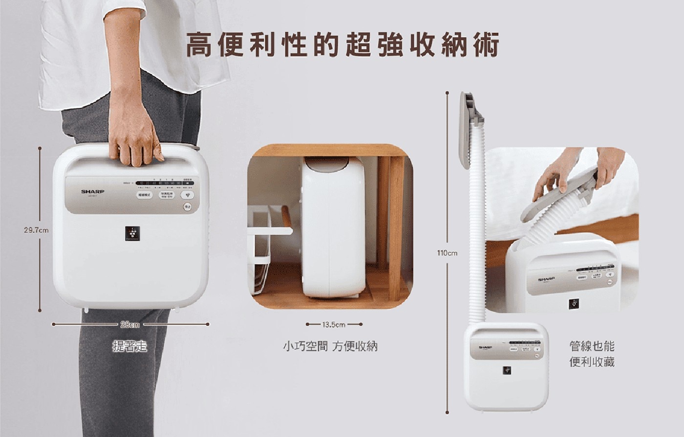 - 可完全收納式送風管,體積小巧易於使用與收納