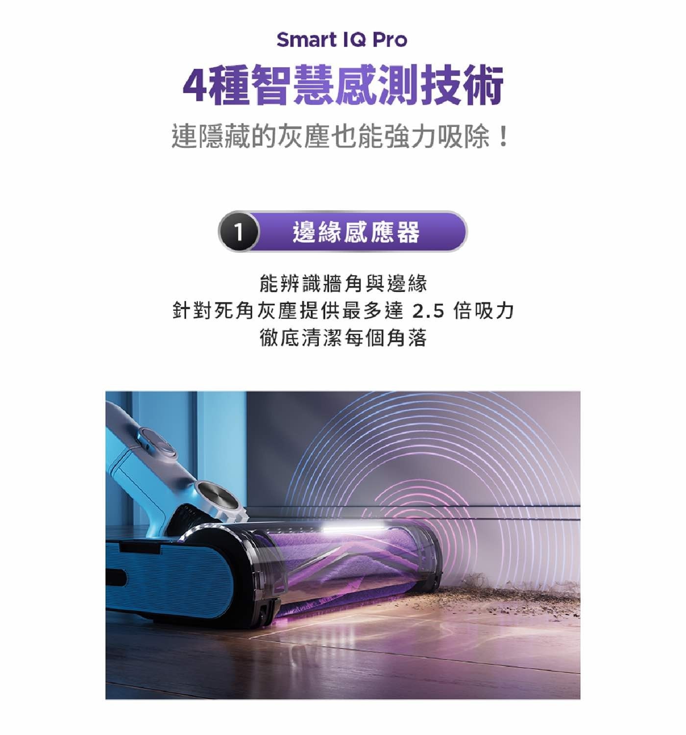 - 邊緣感測器: 接近牆角與邊緣時,吸力自動提升至 2.5 倍