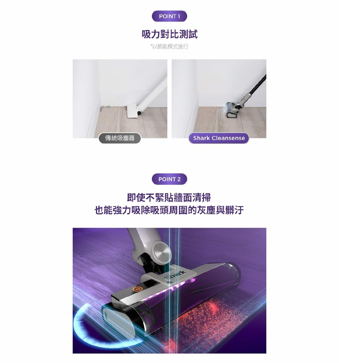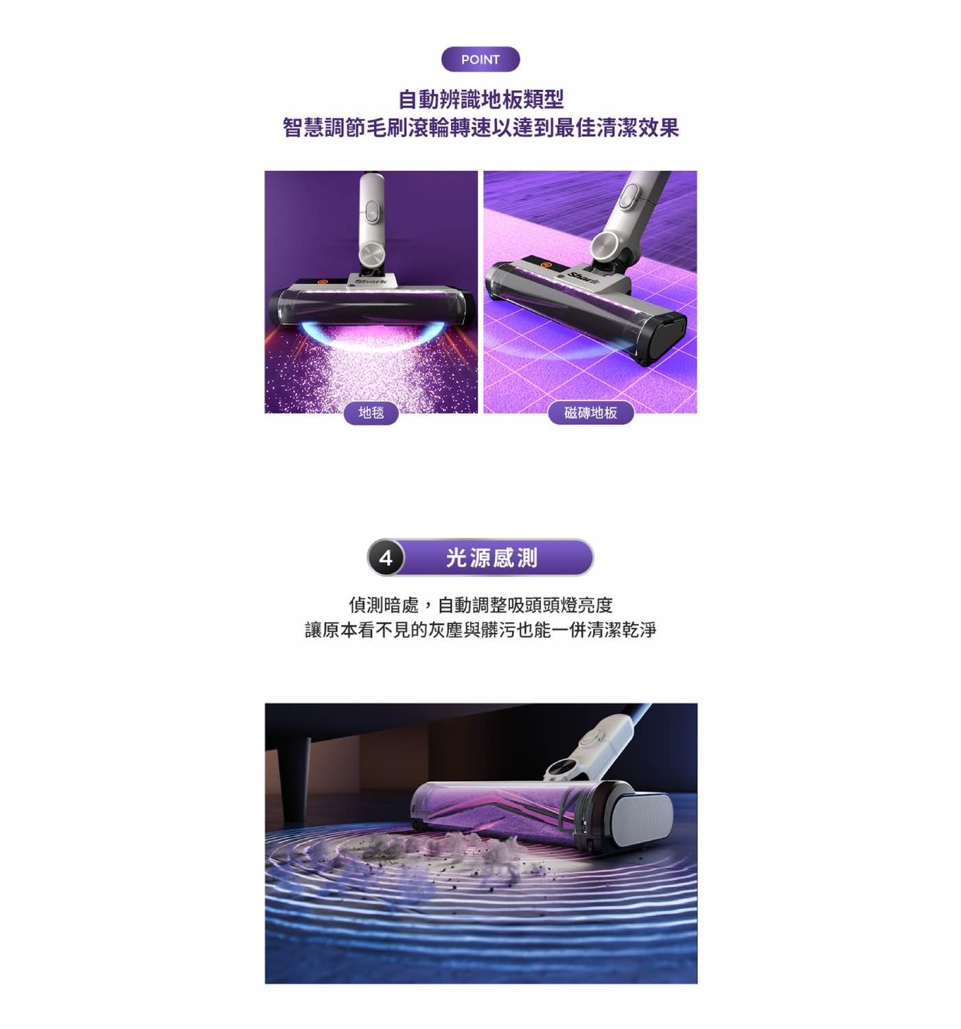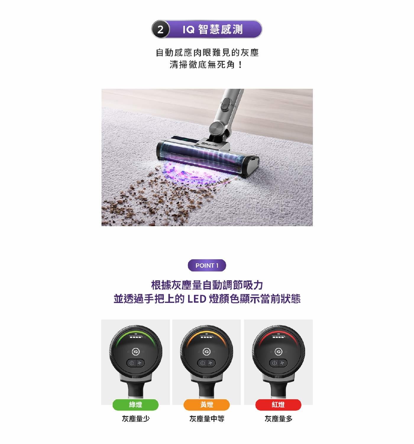 - 光感測器:吸頭發出光源照亮前側灰塵