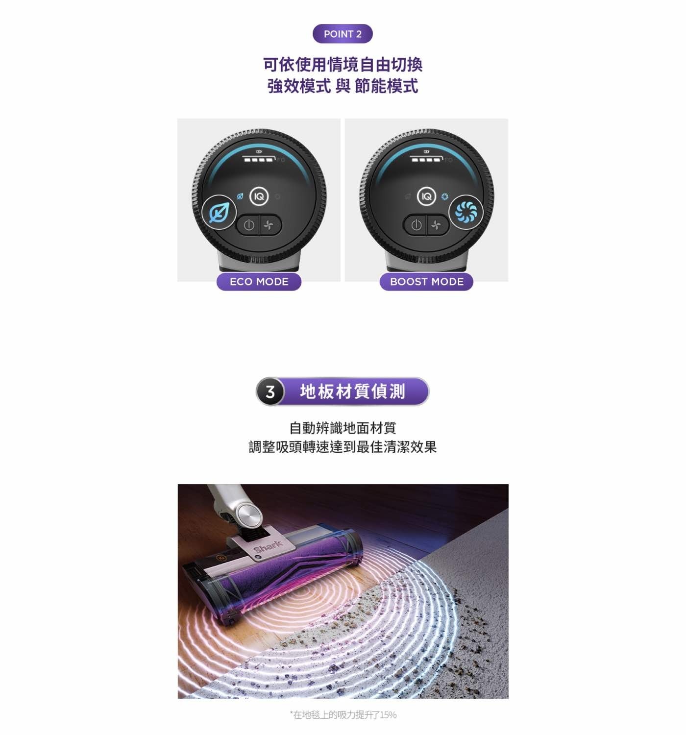 - 地板感測器:感應地板材質,自動調整轉速及吸力