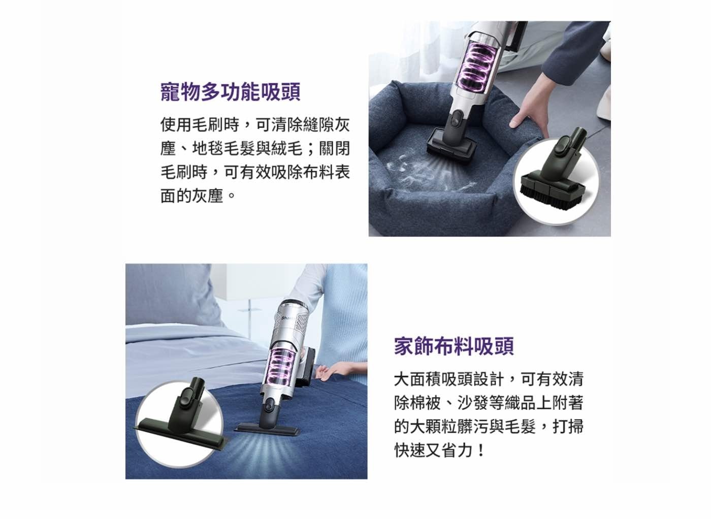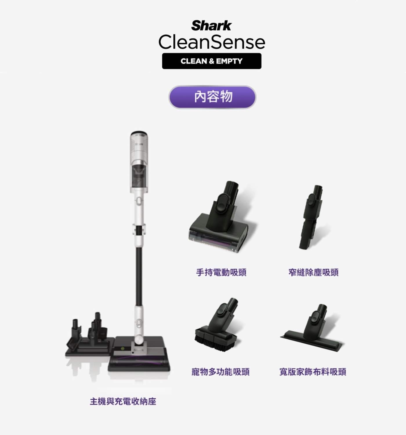| 內容物 | 迷你手持電動吸頭、窄縫除塵吸頭、家飾布料吸頭、配件收納座 |