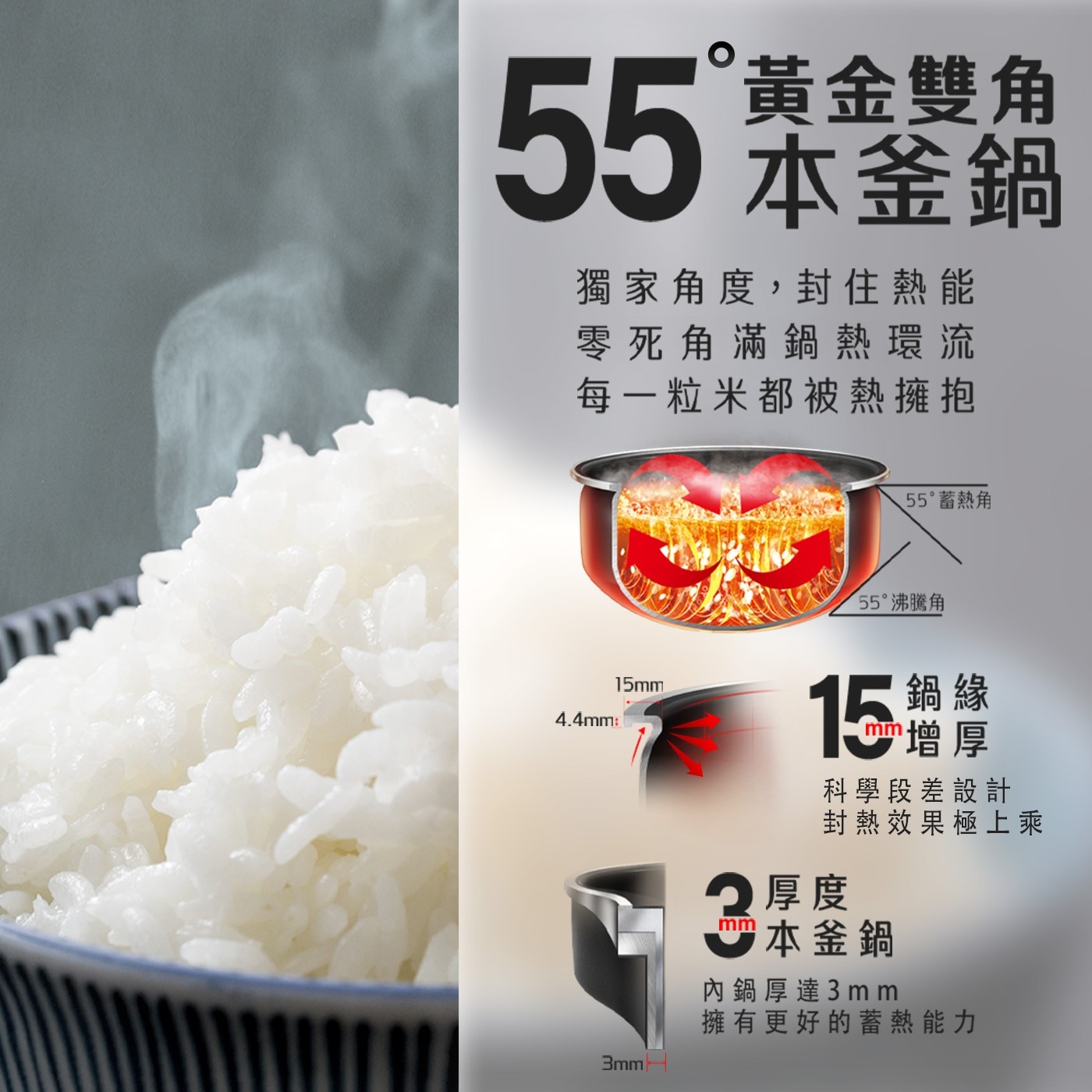 - 55°黃金雙角本釜鍋,封住熱能,熱環流快速導熱,對流均勻