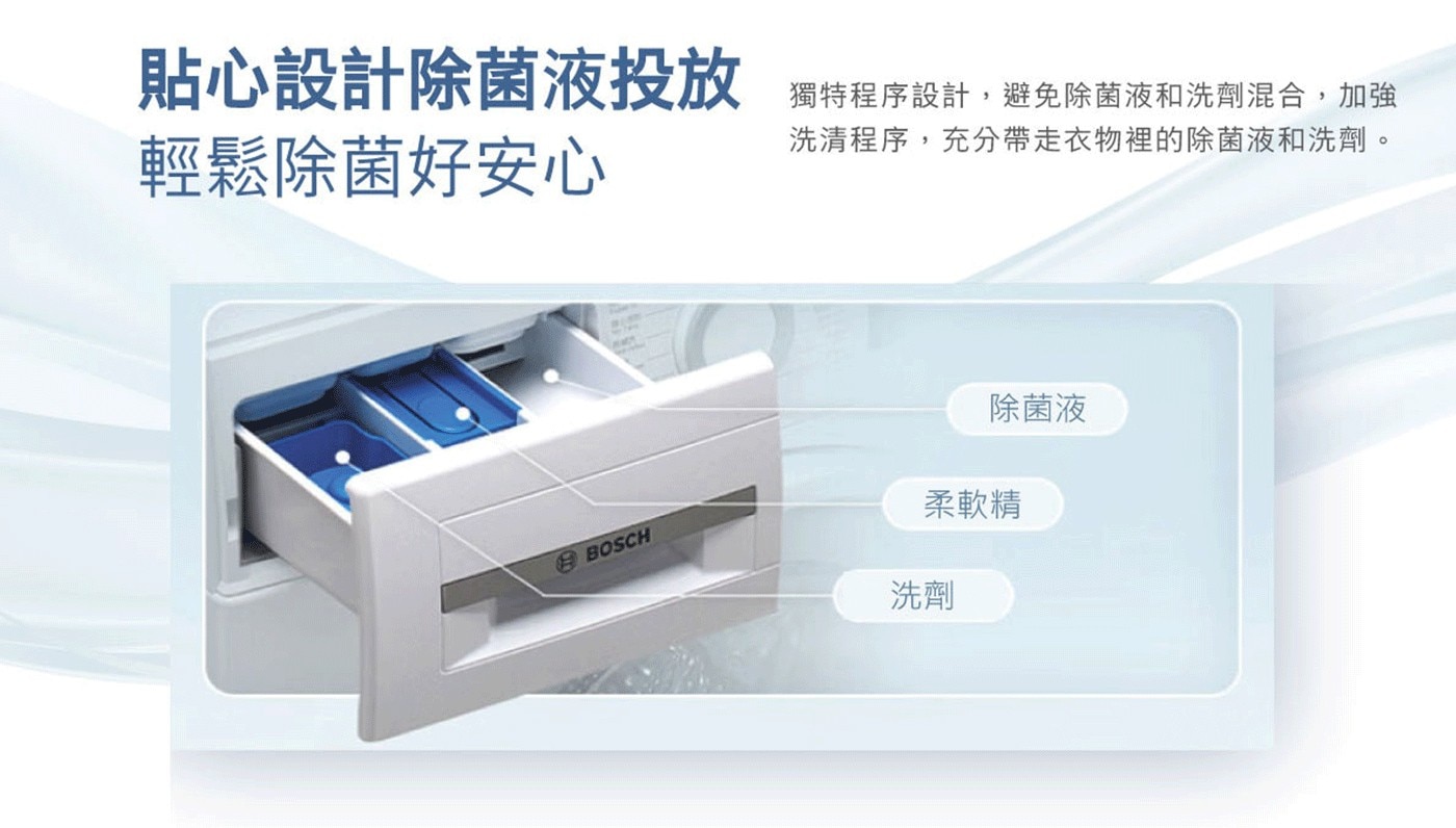 - 4.除菌液投放功能(獨特程序設計,避免除菌液與洗劑混合)