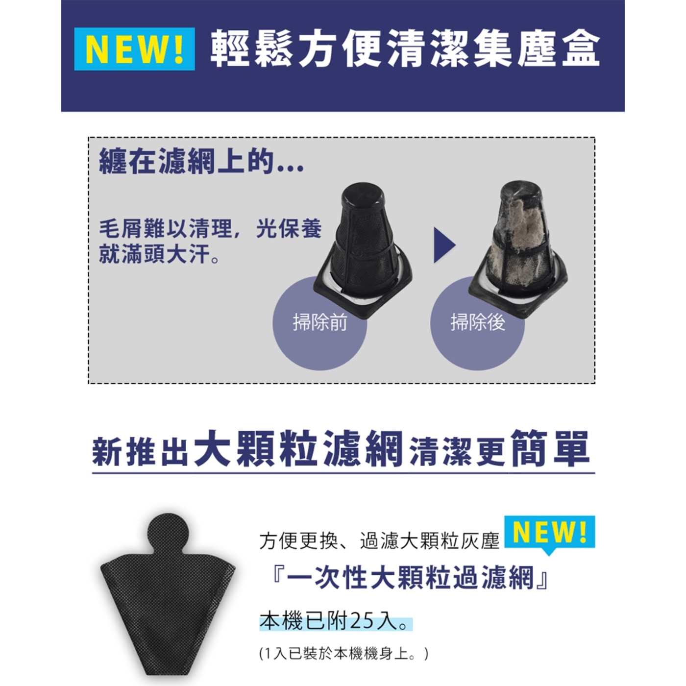 | 內容物 | 主機、HEPA13濾網x1、集塵盒x2、一次性過濾網x25(部份已附於主機上) |