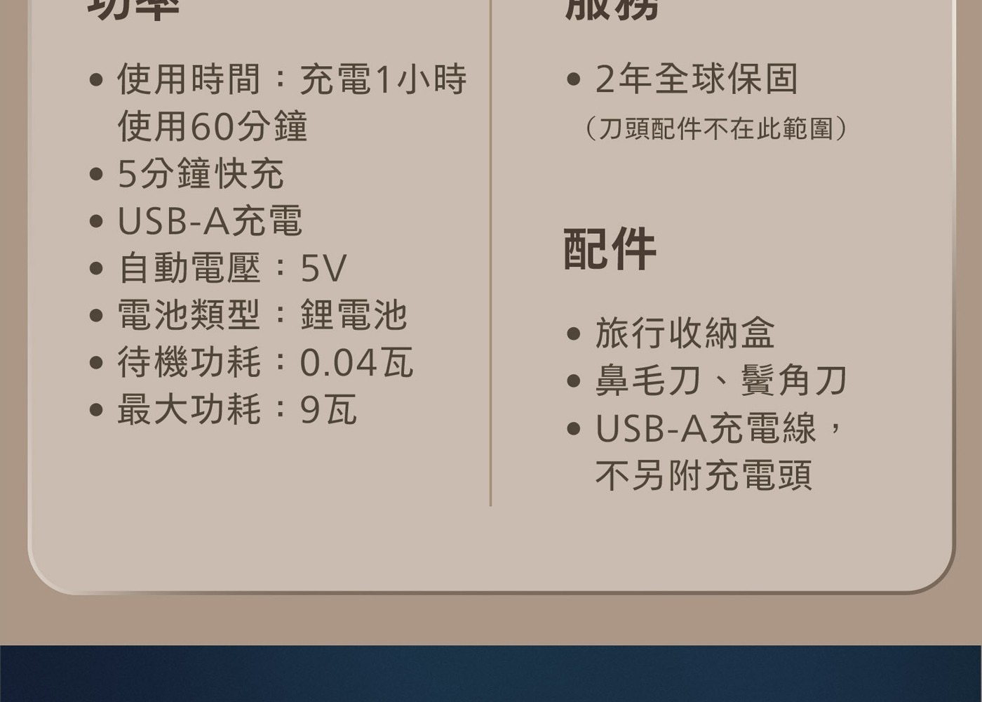 內容物 : 電鬍刀、充電線、收納套、鼻毛刀、鬢角刀