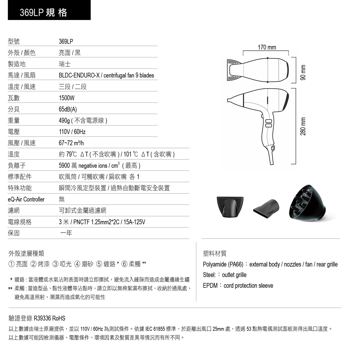 內容物 | 吹風機 X 1、吹嘴 X 2、烘罩 X 1、說明書 X 1 |