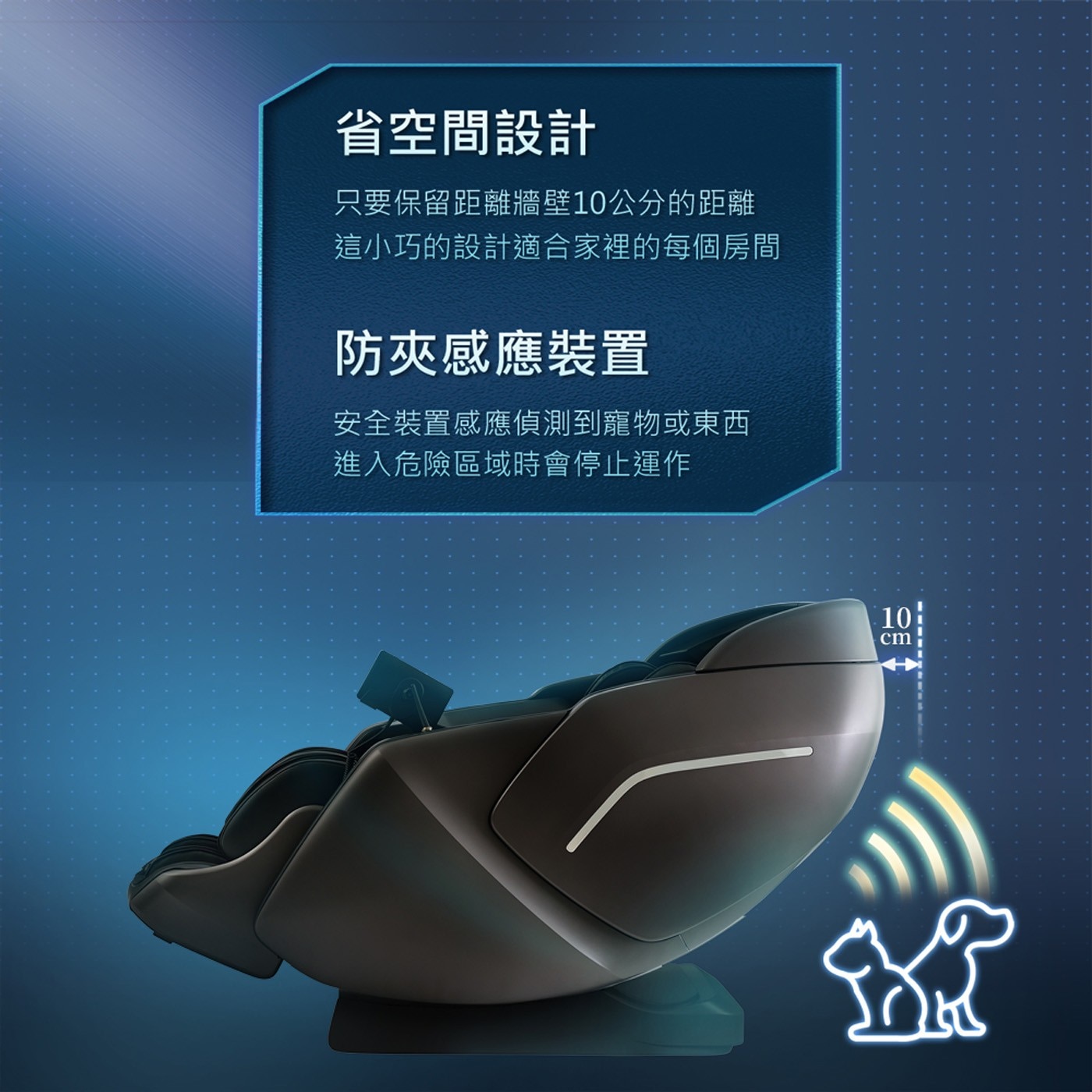 注意事項 | 切勿將椅背從椅上拆除,觸摸按摩椅的內部機件可能導致觸電 切勿擅自拆移內部機件,或自行修理按摩椅,可能導致火災或觸電 進行保養時,請拔除電源插頭,否則可能會導致觸電和受傷 按摩椅應隨時保持清潔及無灰塵,請放置在乾燥不潮濕的地方 如果長期不使用,請用防塵布蓋好,避免蒙上灰塵 切勿將按摩椅放置在陽光下 |