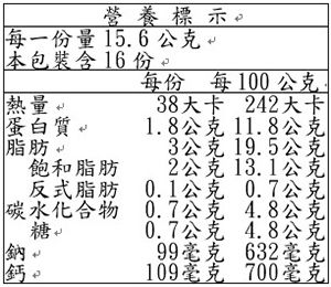 | 注意事項 | 本產品之反式脂肪來自於天然生乳,非經氫化過程所形成 |