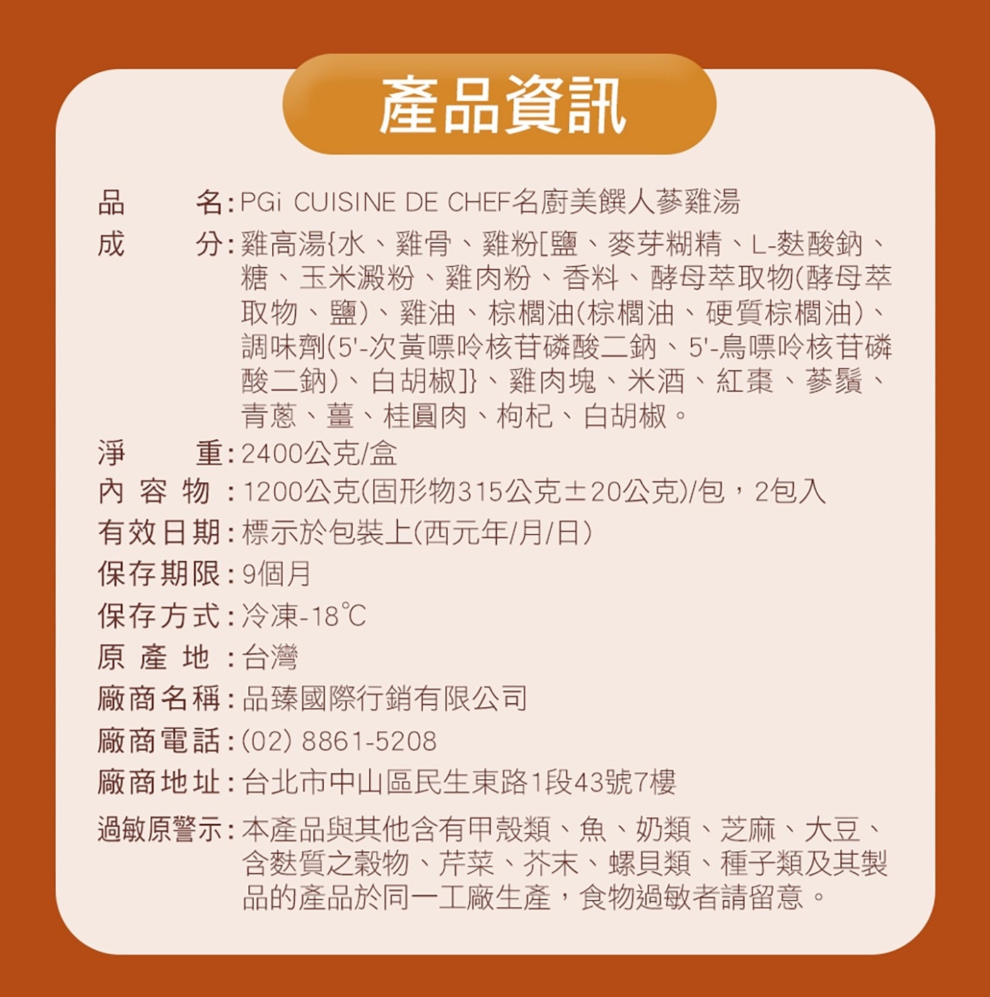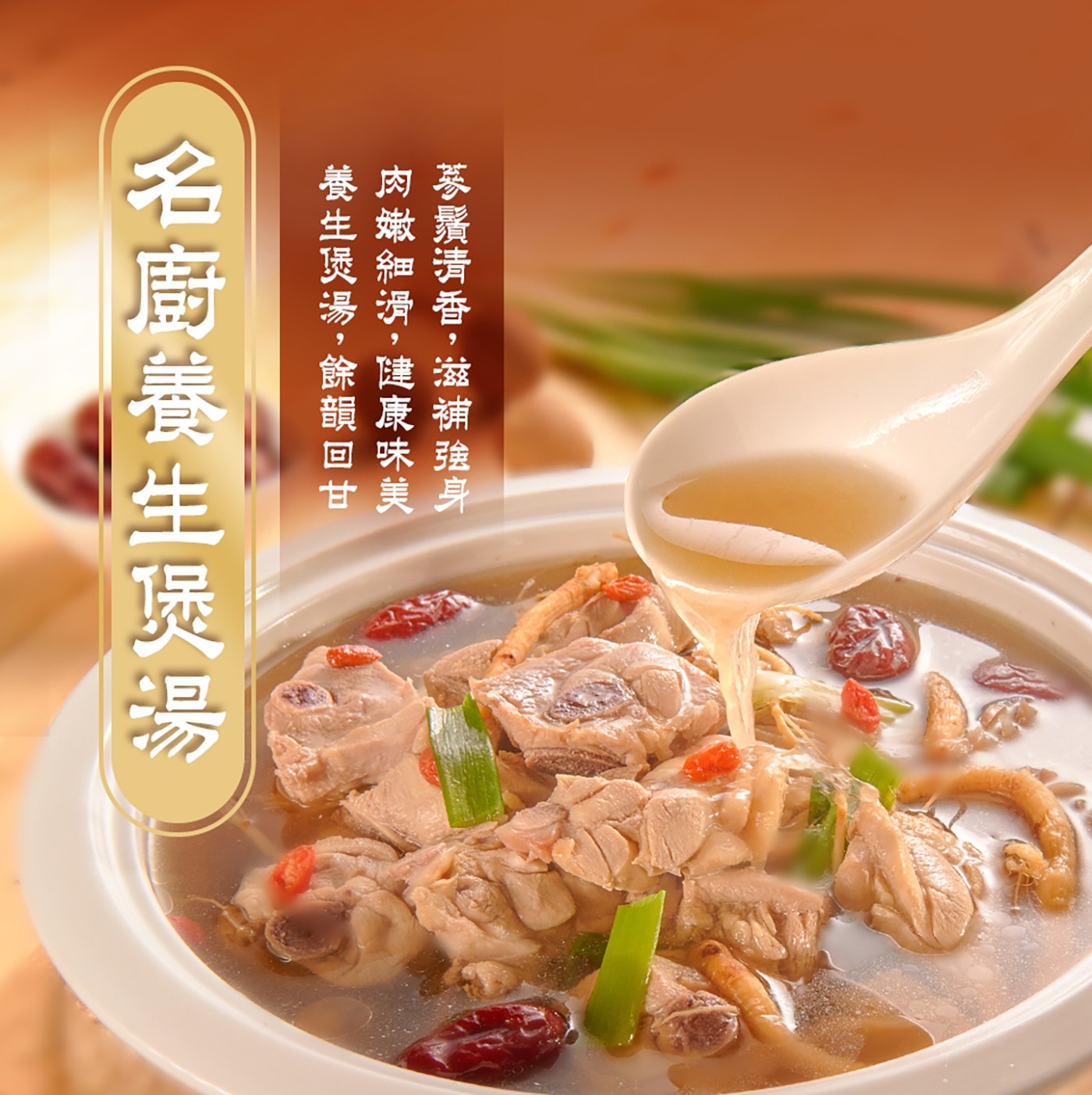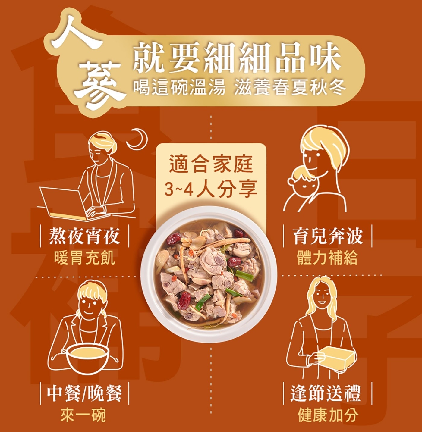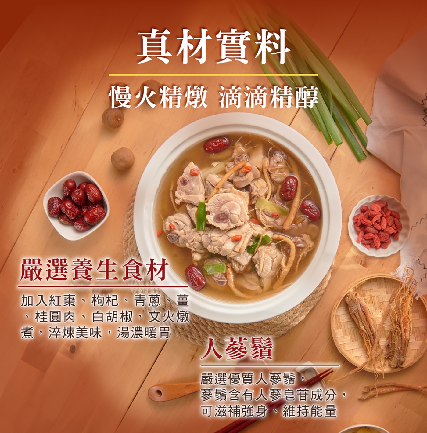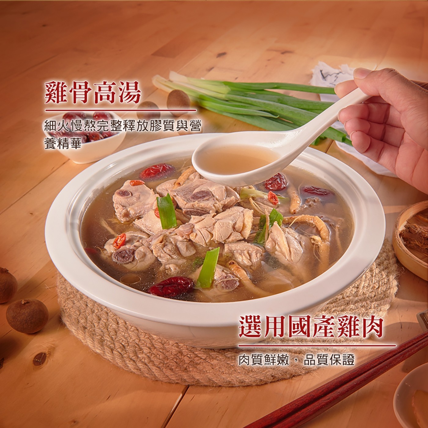 成分 | 雞高湯{水、雞骨、雞粉〔鹽、麥芽糊精、L-麩酸鈉、糖、玉米澱粉、 雞肉粉、香料、酵母萃取物(酵母萃取物、鹽)、雞油、棕櫚油(棕櫚油、硬質棕櫚油)、 調味劑(5'-次黃嘌呤核苷磷酸二鈉、5-鳥嘌呤核苷磷酸二鈉)、白胡椒〕}、 雞肉塊、米酒、紅棗、蔘鬚、青蔥、薑、桂圓肉、枸杞、白胡椒 |
