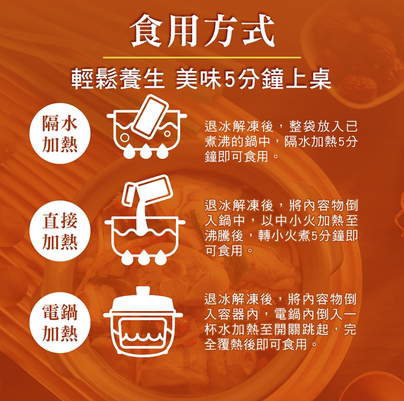 使用方式 | 1.完全解凍後,整袋放入已煮沸的鍋中,加熱5分鐘即可。 2.完全解凍後,將內容物倒入鍋中,中小火加熱至沸騰後,轉小火煮5分鐘即可。 3.完全解凍後,將內容物倒入容器內,電鍋內倒入一杯水,加熱至開關跳起即可。 |