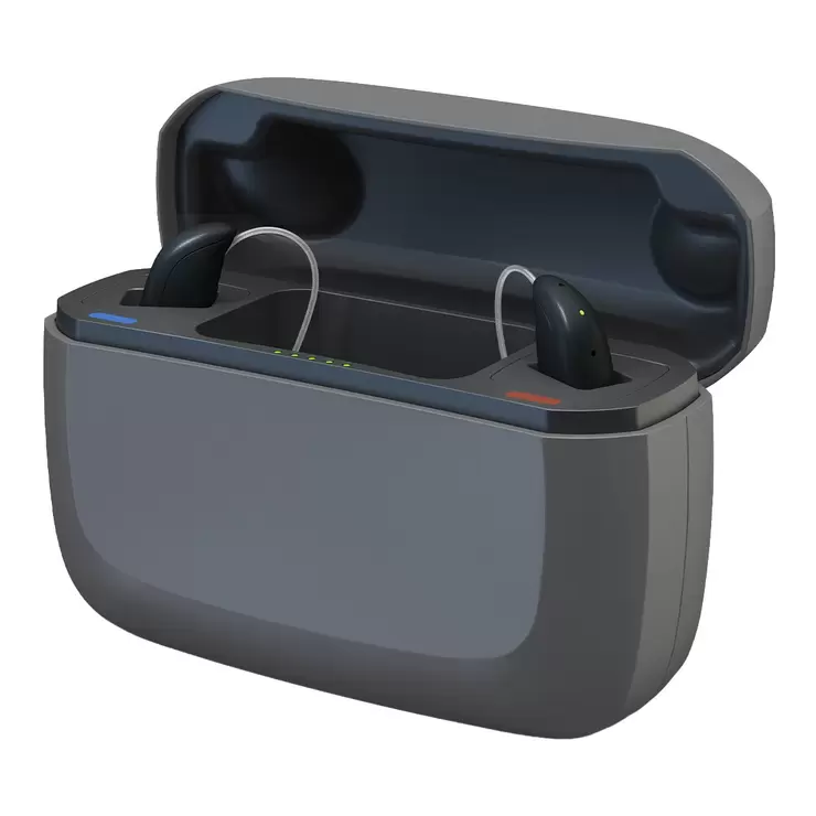 - 使用上非常直觀,前側5個LED燈可用於顯示助聽器的電量,後側3個LED燈可用於顯示充電器的電量