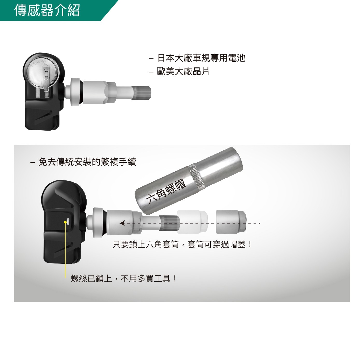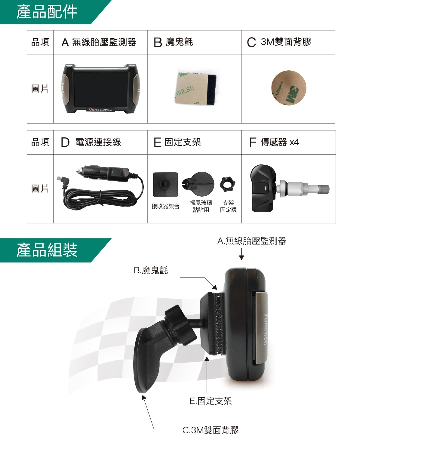 | 內容物 | 顯示接收主機X1 胎壓感測器X4 |