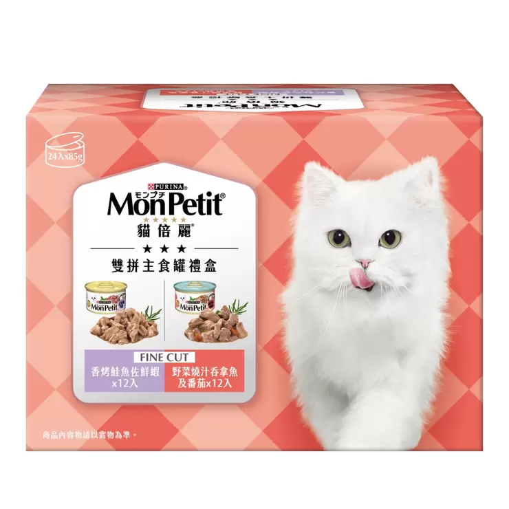 | 內容量/入數 | 85公克 X 24入 (野菜吞拿魚及番茄口味 X 12、炙烤鮭魚與鮮蝦口味 X 12) |