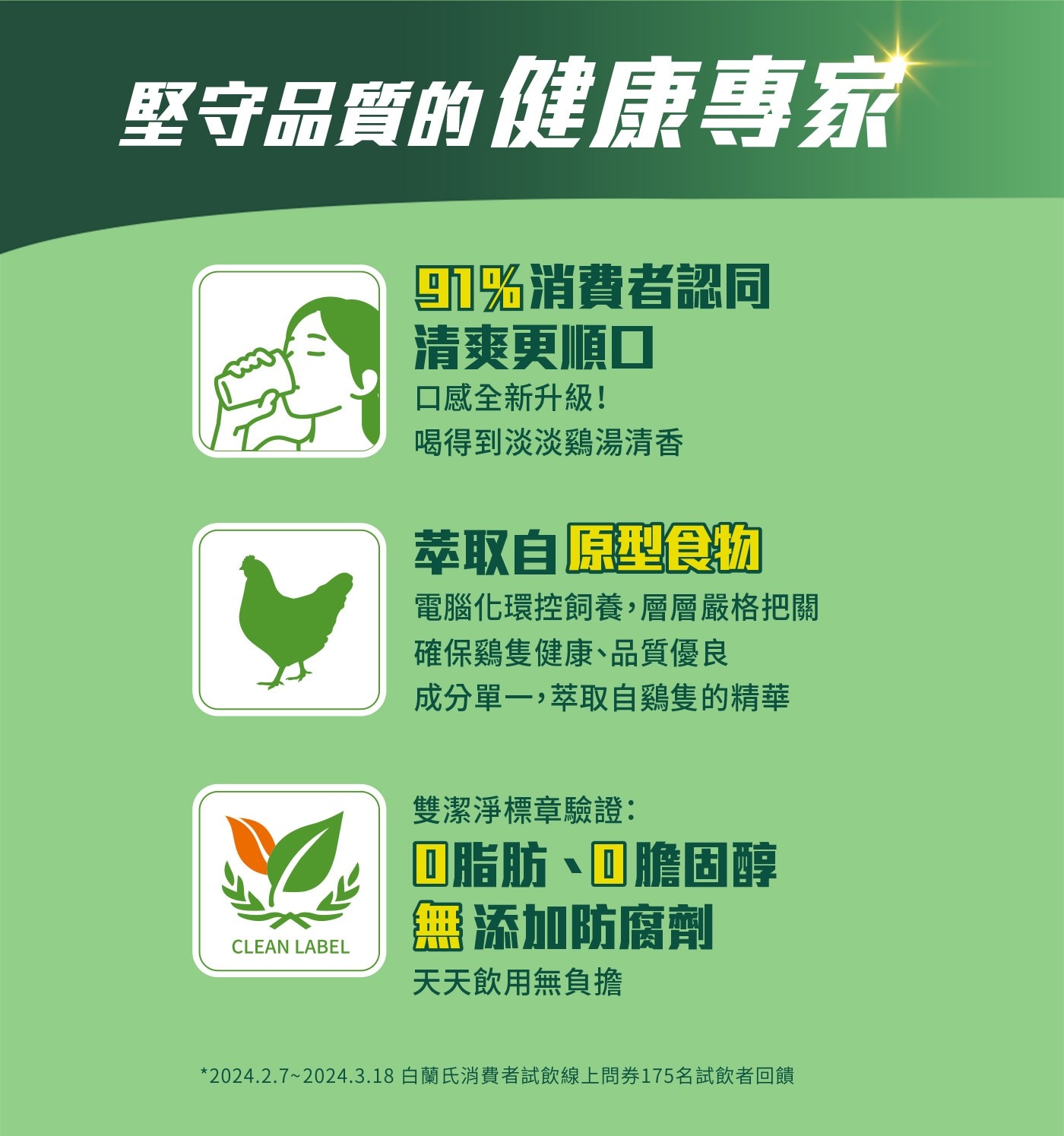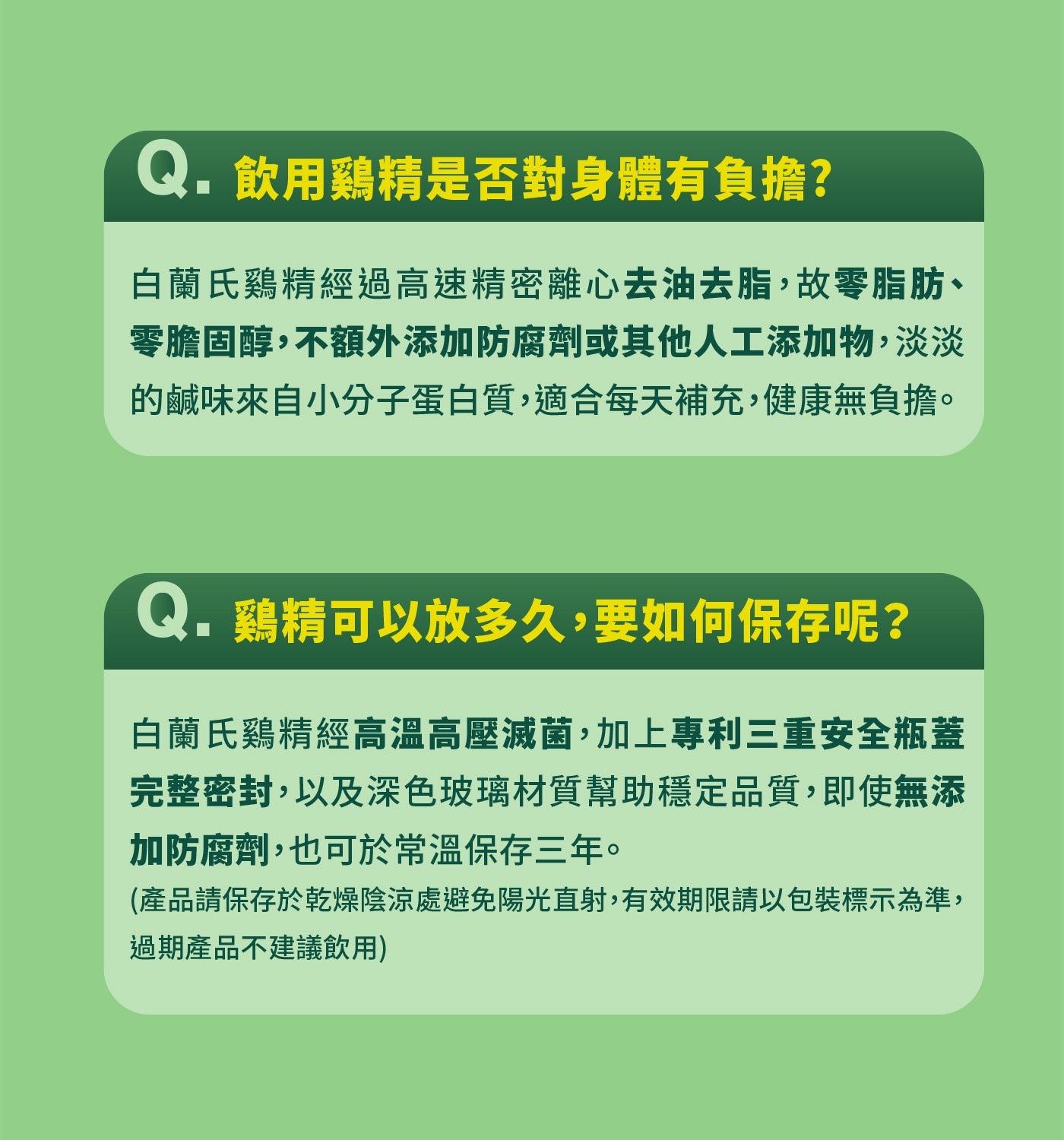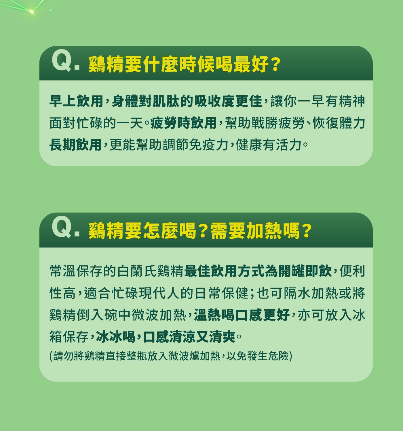 | 注意事項 | 注意事項: 1.開瓶後,請立即飲完。 2.請勿直接將鷄精瓶置入微波爐中加熱。 3.請洽詢醫師或營養師有關食用本品之意見:均衡的飲食及適當的運動為身體健康之基礎,請依個人體質酌量使用。 4.本產品供保健用,請依建議攝取量食用。 警語: 1.如有特殊體質,請向專業人士諮詢。 2.支鏈有機酸尿症(遺傳性疾病,例如:楓糖尿症)患者,應避免食用。 3.有過敏或自體免疫疾病者,請諮詢醫師建議後使用。 4.本產品不能治療、矯正任何疾病,有病者仍需就醫。 |